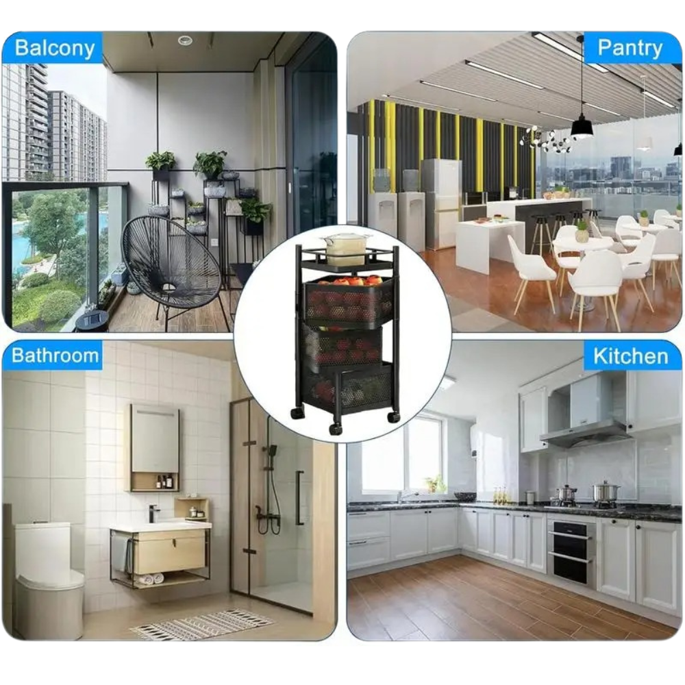 Keep your home organised, practical and stylish with this rotating storage trolley. Its vertical and compact design is made to optimise space while keeping everyday items within easy reach, fitting perfectly in kitchens, pantries, bathrooms or balconies.